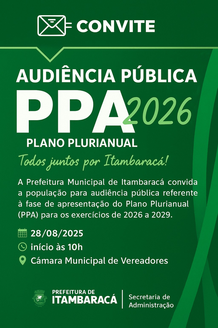 Convite - Audiência Pública PPA 2026 Publicado em 25 de agosto de 2025 às 16:58 hs. | Geral Compartilhe: