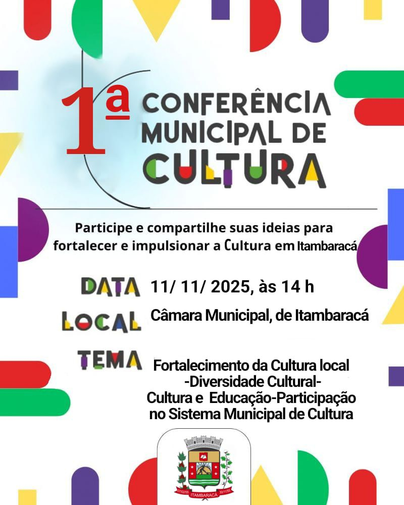 CONVITE PARA A 1º CONFERÊNCIA MUNICIPAL DE CULTURA DE ITAMBARACA Publicado em 29 de outubro de 2025 às 16:30 hs. | Eventos Municipais Compartilhe: